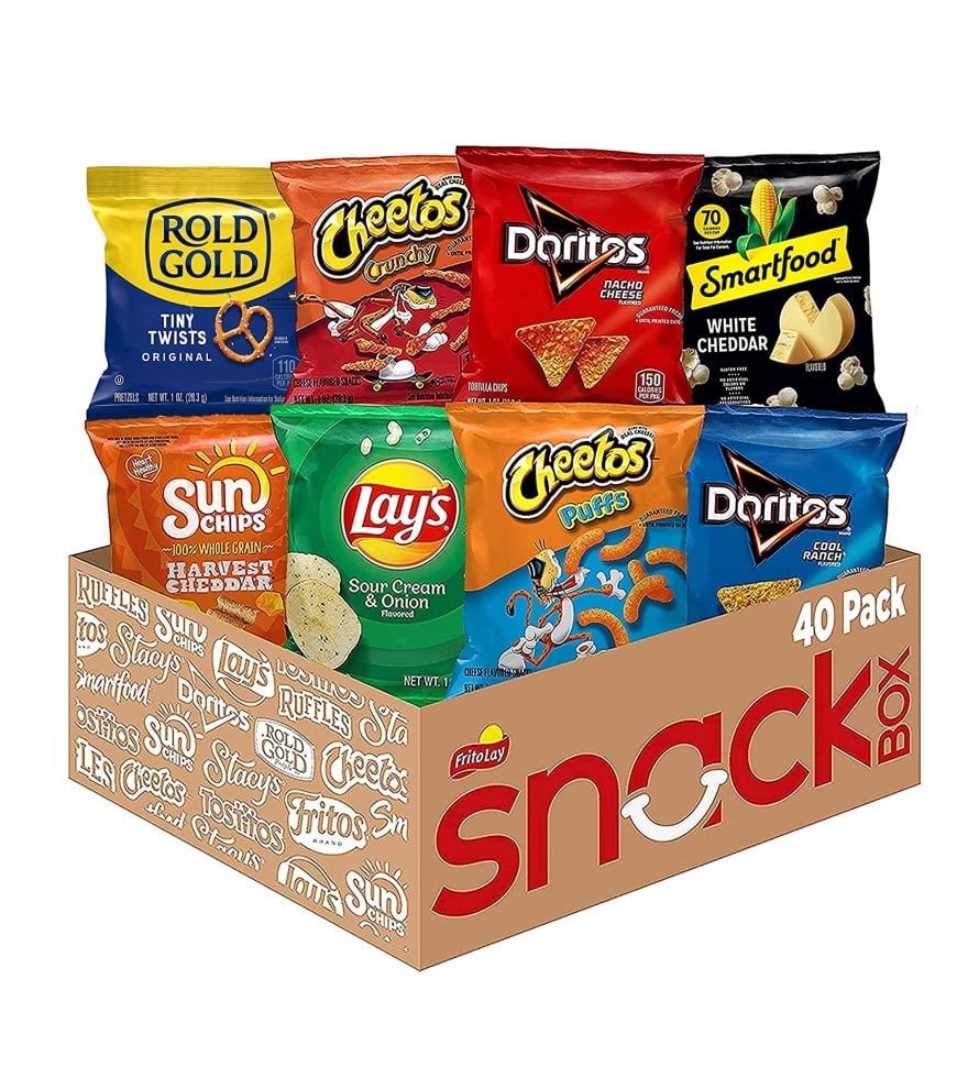 40 single serve favorites – Doritos Nacho Cheese. Doritos Cool Ranch. Lay’s Sour Cream & Onion. Rold Gold Tiny Twists. Smartfood White Cheddar Popcorn. Cheetos Crunchy. Cheetos Puffs. and Sunchips Harvest Cheddar