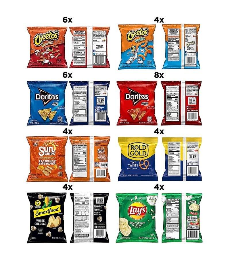 Includes (8) 1 oz bags of Doritos Nacho Cheese. (6) 1 oz bags of Doritos Cool Ranch. (4) 1 oz bags of Lay’s Sour Cream & Onion. (4) 1 oz bags of Rold Gold Tiny Twists. (4) 0.625 oz bags of Smartfood White Cheddar Popcorn. (6) 1 oz bags of Cheetos Crunchy. (4) 0.875 oz bags of Cheetos Puffs. and (4) 1 oz bags of Sunchips Harvest Cheddar