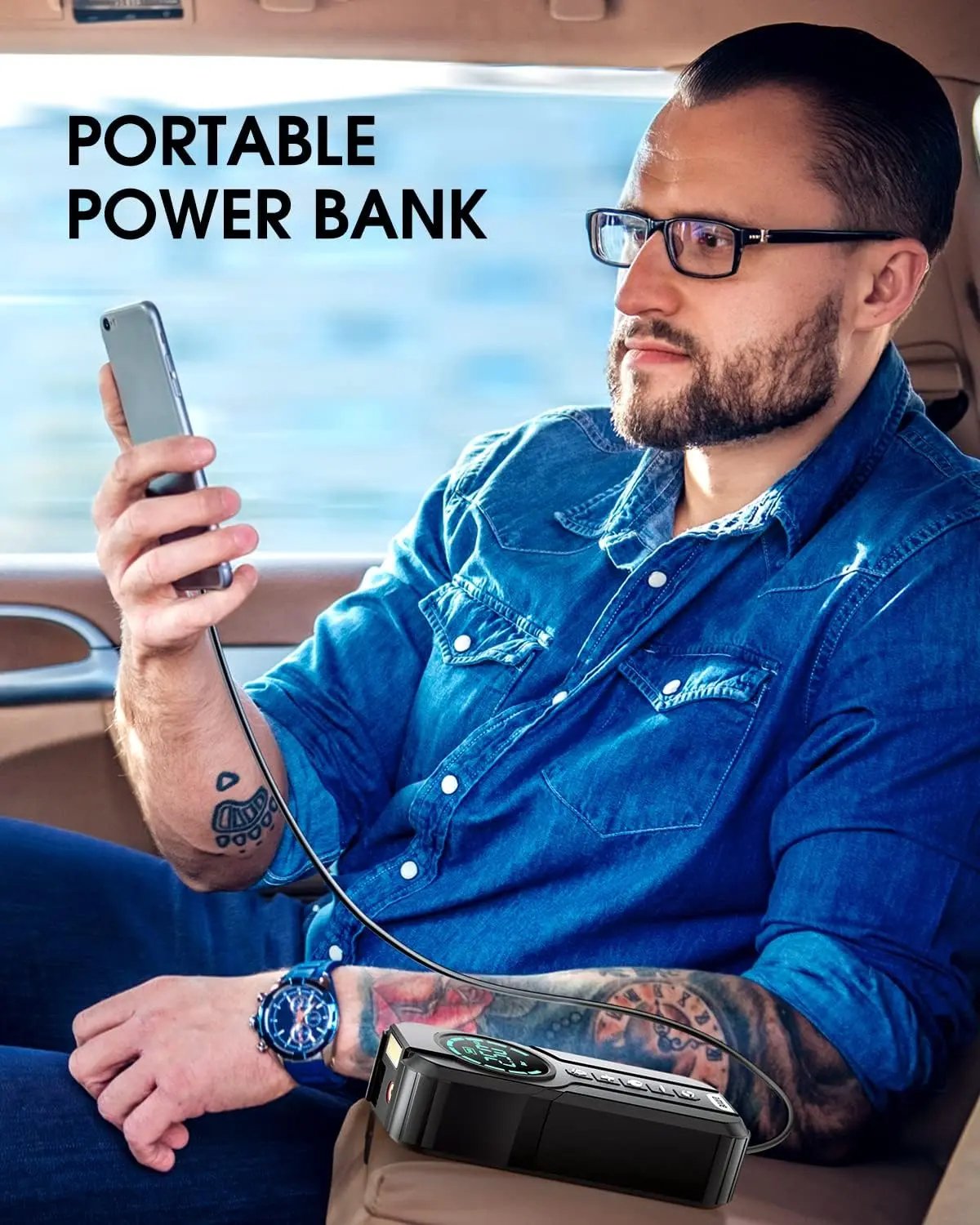 - ??4 In 1 Multi-Function??This is not only a battery jumper starter portable Tire Inflator but also a portable power bank LED flashlight to charge smart phones tablets and other mobile devices. Supports fast charging B 3.0 Output: 5V/2A Input: 5V/2A. In addition the integrated 300-lumen LED flashlight has 3 lighting modes constant light strobe light and SOS light.