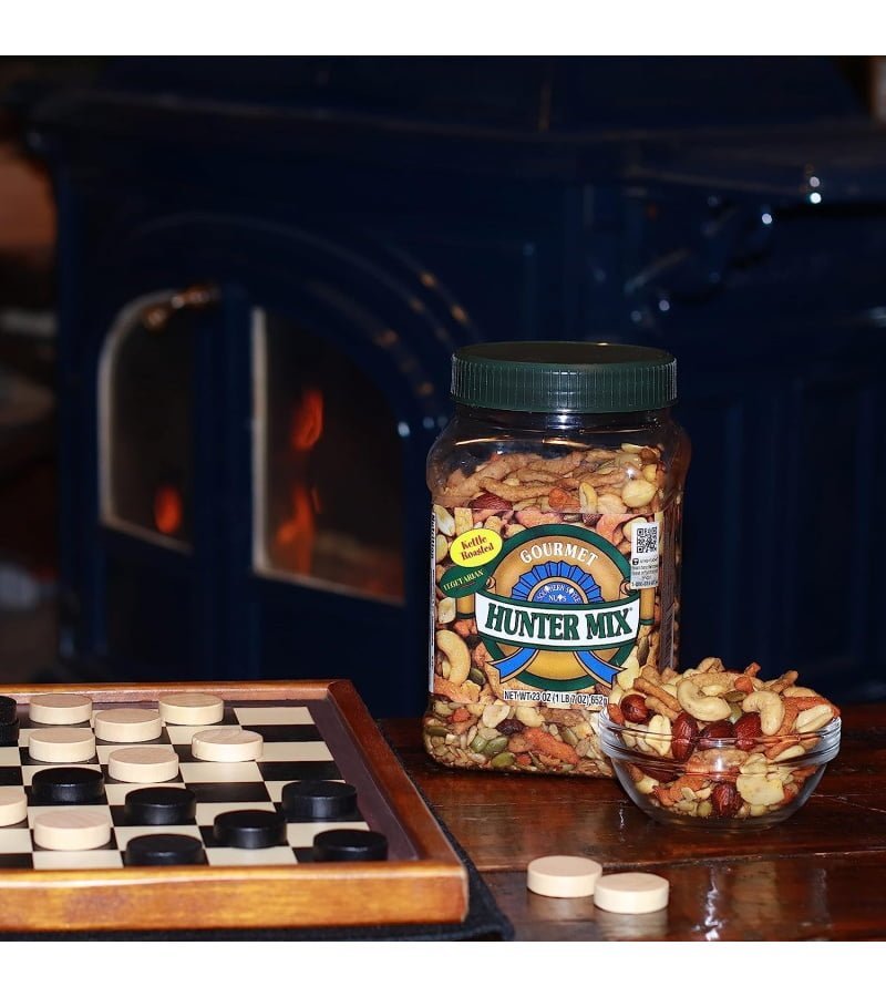Contains 1- 23 Ounce reusable canister of Southern Style Nuts Gourmet Hunter Mix