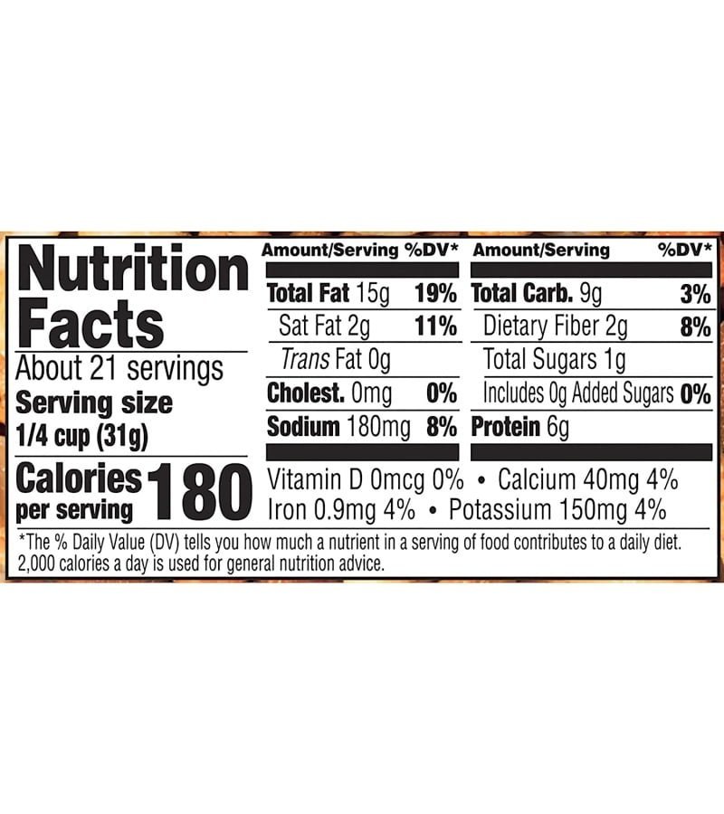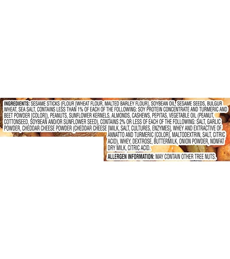 A flavorful crunchy mix of sesame sticks. peanuts. sunflower kernels. almonds. cashews. and pepitas all seasoned with a special blend of spices